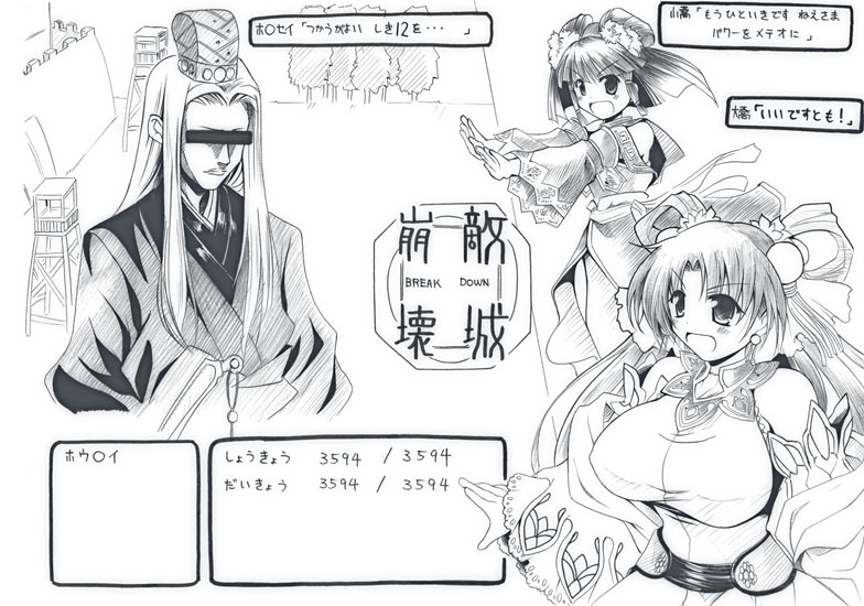 三国志大戦3のようなFF4のような。 とりあえずR小喬とR大喬とあとver3.0壊れコモンです。 画像クリックででかいの。 (流星→メテオ)+(喬姉妹→ふたりがけ)=Wメテオ →いいですとも! みたいなね。 ラスボスはもちろん長槍のあの人。 柵の向こうから敵陣閃陣槍撃やめて やめて敵陣閃陣槍撃 粘れない時はほんとどうしようもない。 戻る